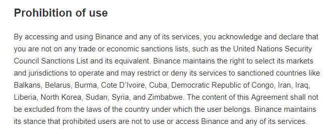 با دسترسی و استفاده از خدمات باینانس شما اذعان و تائید میکنید که در لیست تحریمهای تجاری و اقتصادی مانند فهرست تحریمهای شورای امنیت سازمان ملل و معادل آن نیستید. باینانس حق انتخاب بازار و حوزهی قضایی خود را دارد و ممکن است کاربران کشورهای بالکان، بلاروس، میانمار، ساخل عاج، کوبا، جمهوری دموکراتی کنگو، ایران، عراق، لیبی، کرهشمالی، سوریه، سودان و زیمباوه محدود و مسدود کند. محتوای این توافقنامه از قوانین کشوری که کاربر متعلق به آن است، تخطی نخواهد کرد. باینانس در قبال اینکه کاربران ممنوع شده قادر به دسترسی و استفاده از خدمات آن نیستند، موضع خود را حفظ میکند..