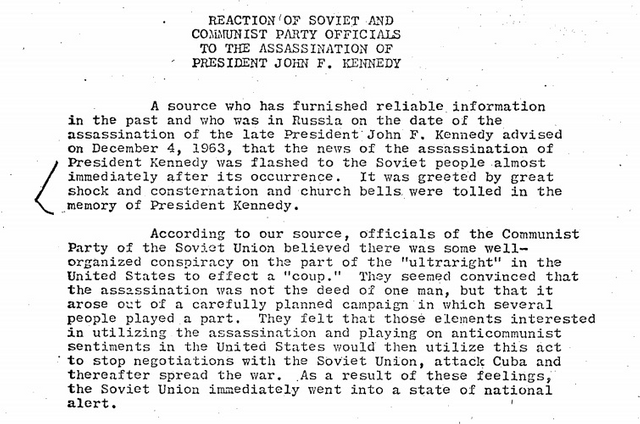 ”FBI source claimed KGB had data indicating LBJ was responsible for assassination of JFK" .. "Our source added that in the instructions from Moscow, it was indicated that 'now' the KGB was in possession of data purporting to indicate President Johnson was responsible for the assassination of the late President John F. Kennedy. KGB headquarters indicated that in view of this information, it was necessary for the Soviet Government to know the existing personal relationship between President Johnson and the Kennedy family, particularly that between President Johnson and Robert and 'Ted' Kennedy."