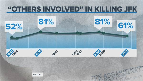 Whatever the reason, the conspiracy figure stayed relatively high in the Gallup data, not dropping below 74% for decades. The latest numbers from Gallup, from a 2013 survey taken to mark the 50th anniversary of the event, showed 61% of Americans believed the assassination was a conspiracy, while 30% believed Oswald acted alone.