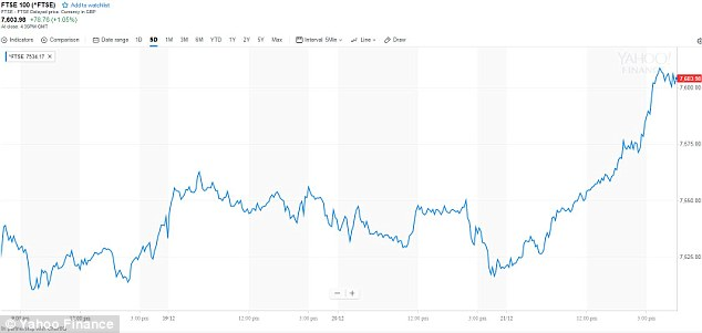The FTSE 100 finished up 78.76 points at 7,603.98, marking the biggest one day gain in December and a new record high