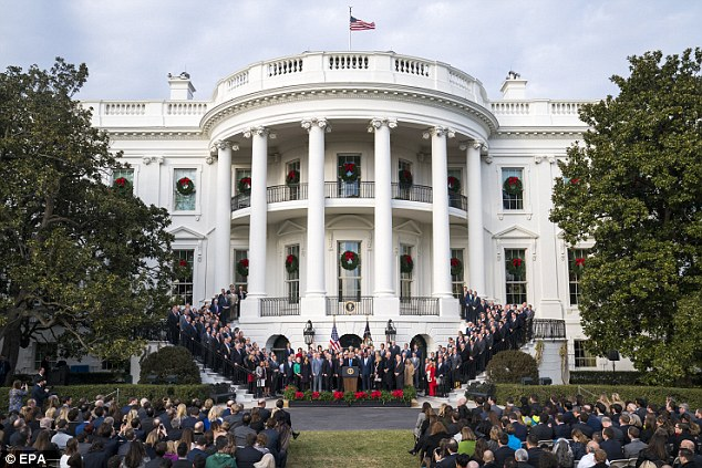 Reform: President Trump with Republican members of the House and Senate following the passing of the tax bill