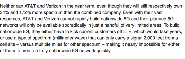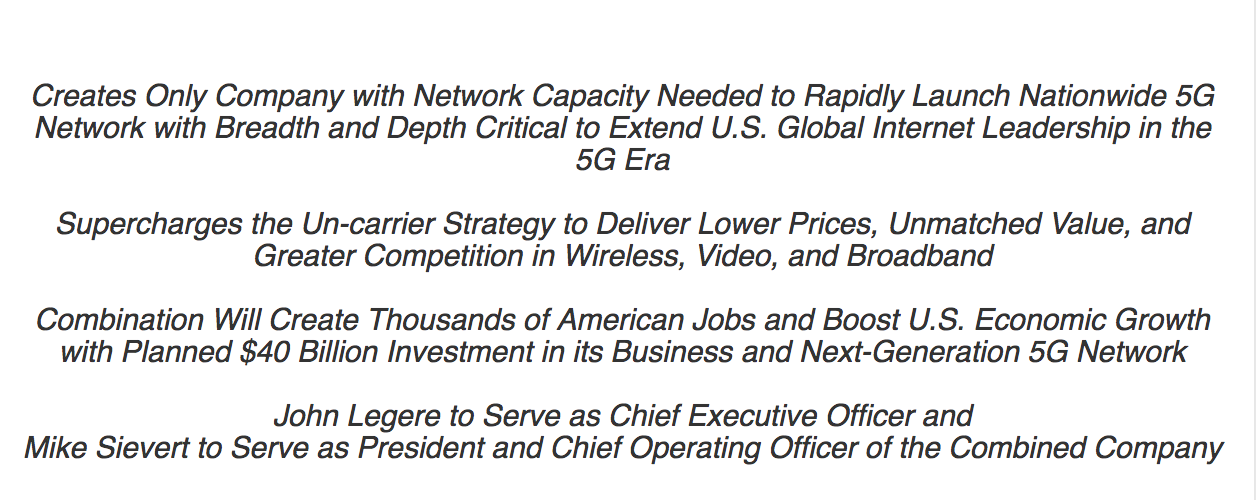 This merger would give T-moile the powerful ability to make a great change in the industries of wireless, video, and broadband. This merger is great for the preparation in the 5G era which T-mobile's goal is to be the leader in offering 5G network to US businesses. T-mobile plans to offer nationwide LTE faster than Verizon and AT&T.