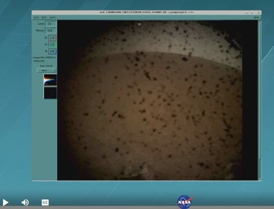 It's a little hard to see with the debris and dust on the dust cover, but eventually the dust cover would be taken off for more clear pictures. But at the bottom of the picture, you can see a rock, and you can see the horizon. At that current moment, everyone was joyful that it worked. Here is a clearer picture when the lens cover was taken off.