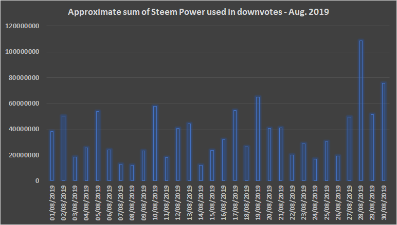 The table below shows the number of downvotes and total SP going into downvotes, using the weight of each vote and the SP owned by the voter.