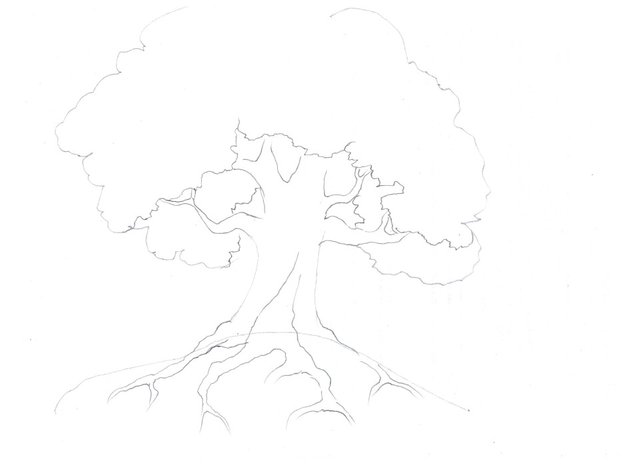 Now draw a tree roots and major veins on the trunk. The roots of our tree as if embraces the hill on which grows.