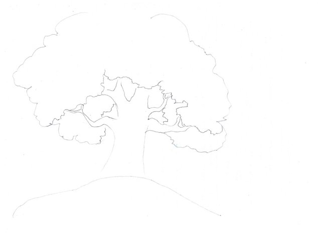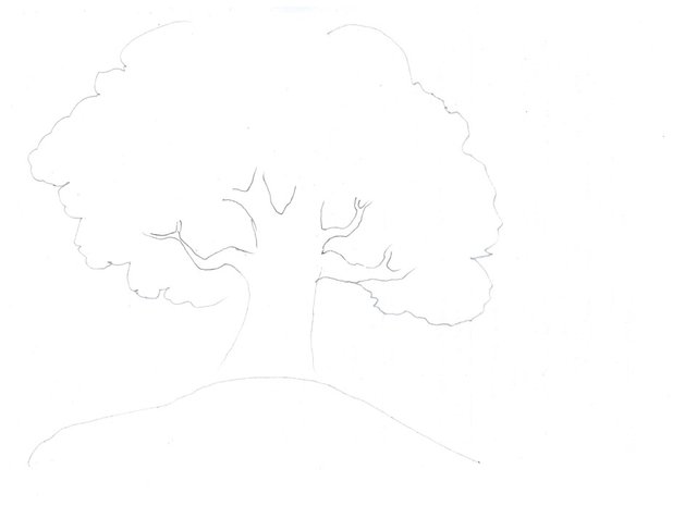 To start, place the painting, relegating the future of the tree a little to the left. Then hold the first line, draw the contour of the hill on which the tree grows, the crown and trunk.