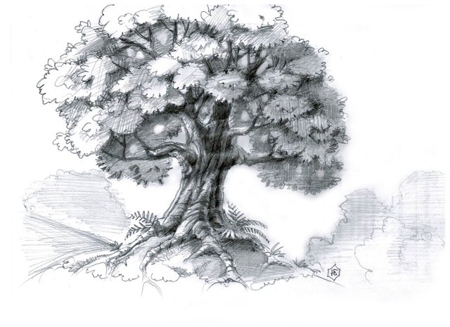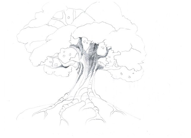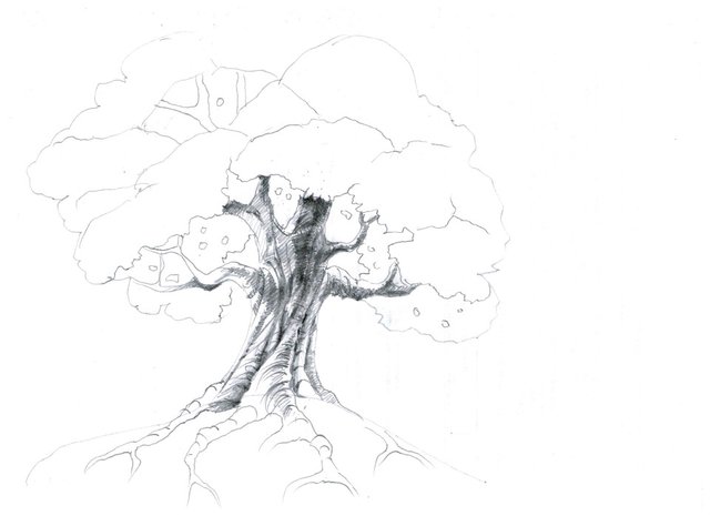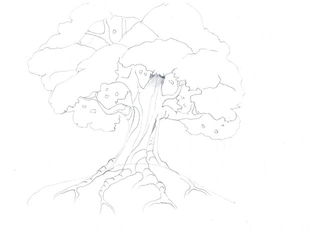 Draw more details on the trunk, roots, and denote the illuminated among the back part of the crown hole in the foliage.