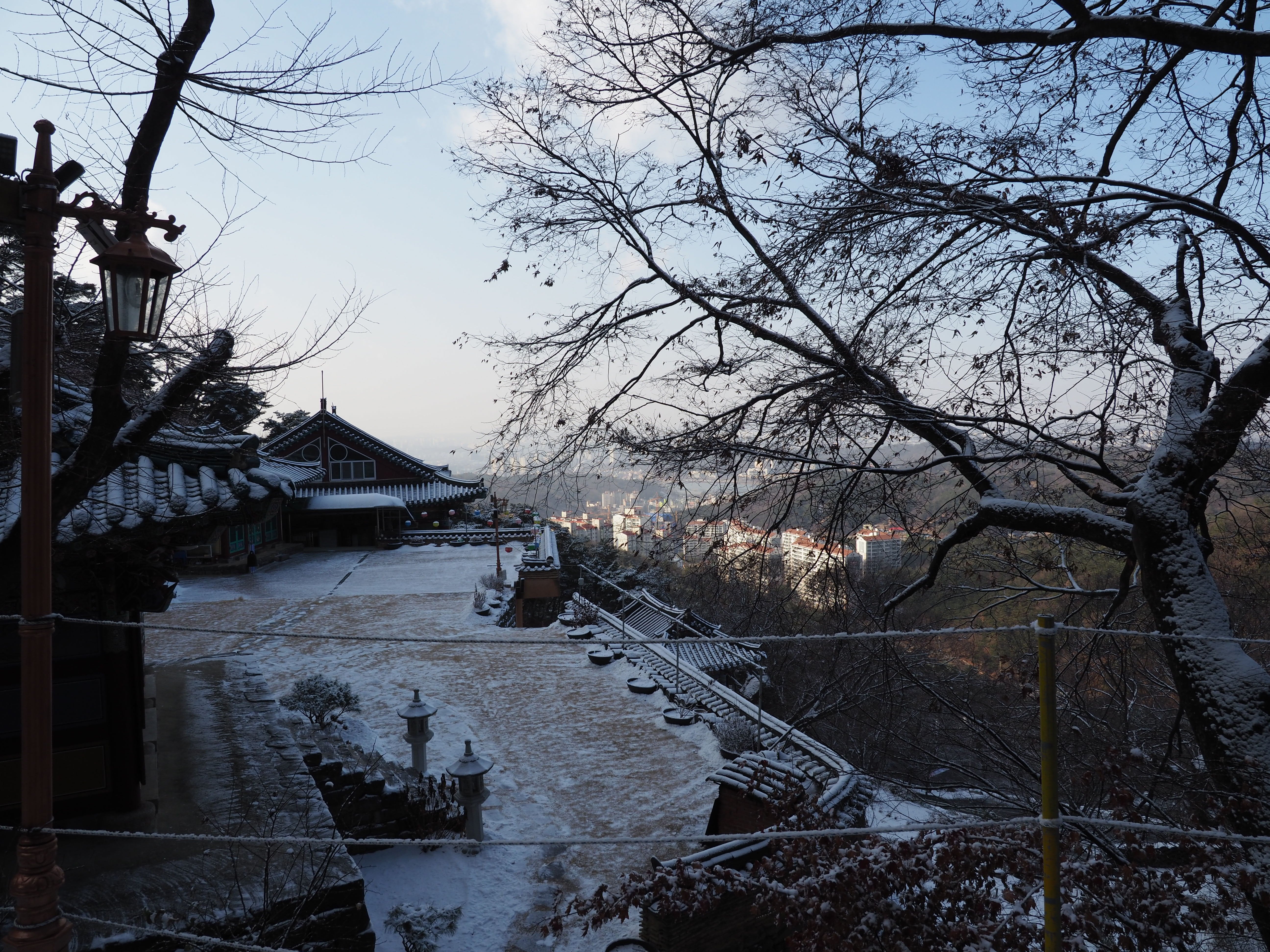 대웅전 앞의 조그만 마당앞으로 내려왔다. 눈이 깨끗하게 치워저 있었다. 주변은 온통 하얀데 노란색 바닥이 드러나 있었다. 땅색이 예뻤다. 황토색이 이렇게 예쁘구나 하고 느끼면서 어깨를 펴고 산아래를 내려다 보았다. 저 멀리 천안시내의 아파트가 눈에 들어왔다. 예전에는 아주 첩첩산중이었을텐데 이제는 산에서 아파트가 보인다.