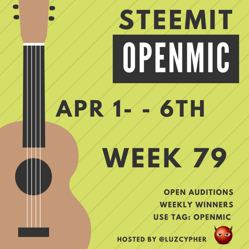 Steemit Open Mic Week 79. This is the one we did for week 68, but we didn't have Scotty, and that's all the difference. Well, most of it - we have borrowed my brother's little Kodak thingy, which is superior to the phone I was using to post those grainy vids. So maybe you like it better this time ;)