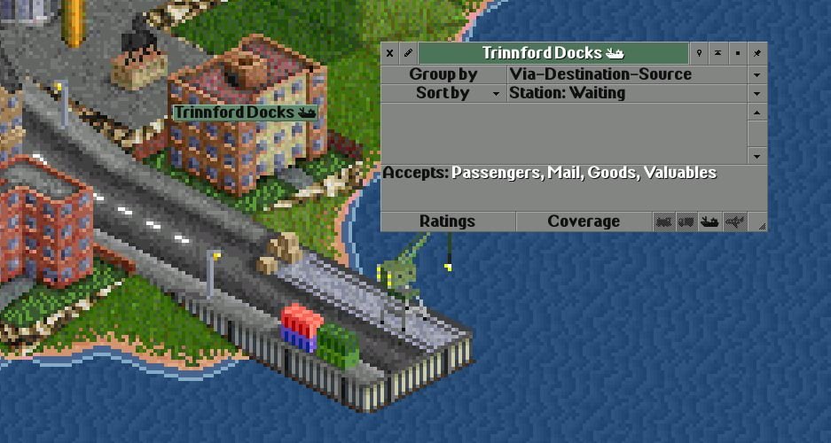 After purchasing the ship, I created a transportation route for it. It will operate between Trainingway-on-Sea Dock and Aberhill Dock.
