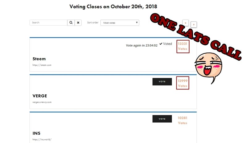 This is my last vote for STEEM COIN on NETCOINs. Based on the results of the current voting, STEEM COIN is in Position No. 1 with a slight difference in votes (number) with VERGE COIN. As in the picture below:**