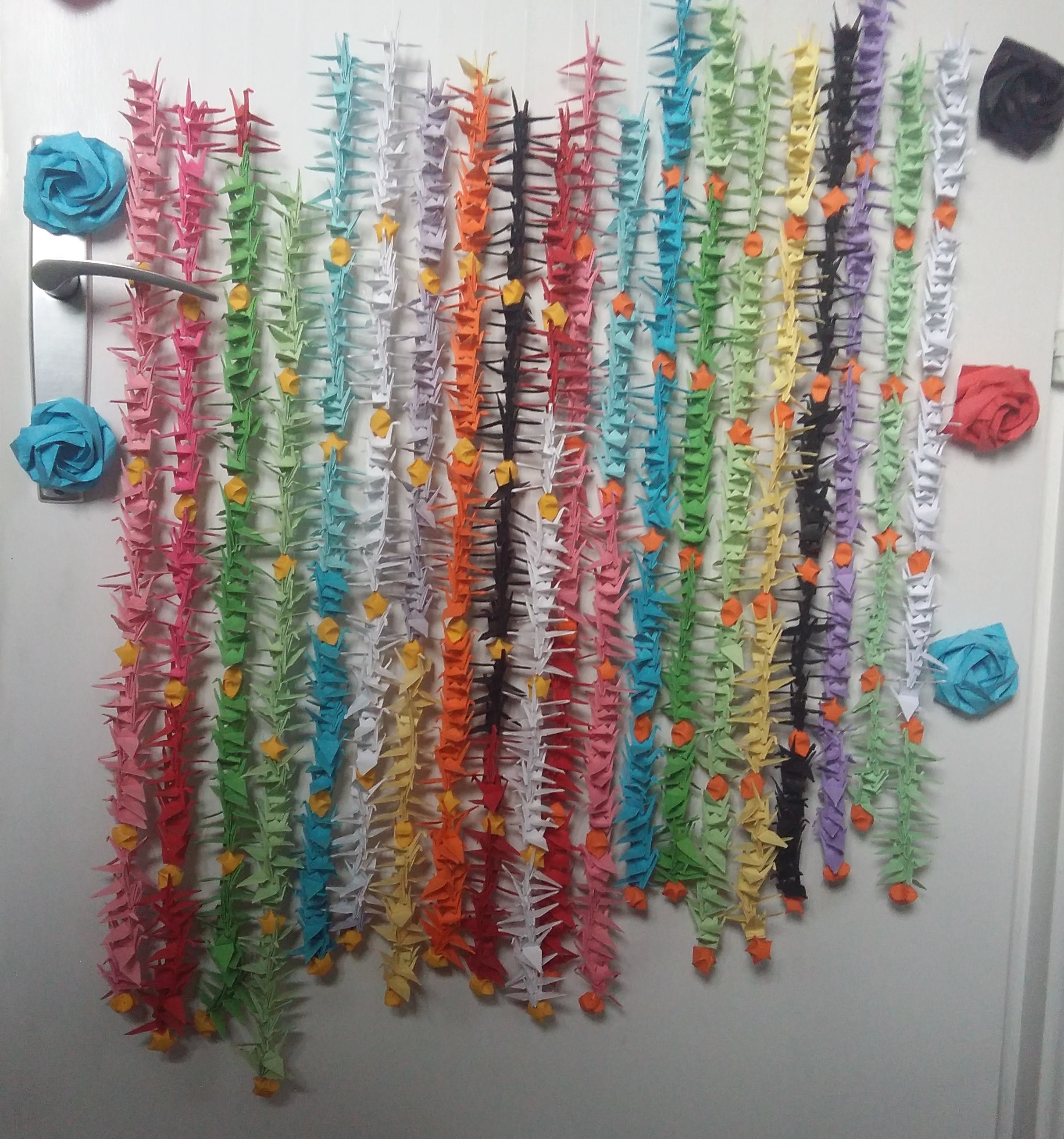Next is an amazing life acomplishment, 2000 origami paper cranes despite being tiny there were enogh to cover a whole door, since I had to hide them before my parents came to visit(not to freak them out) I transferred them to a lamp now, hoping every day it won't collapse from the weight.