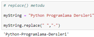 replace() metodunu bunların dışında boşluk algılatmak için de kullanabilirsiniz. Mesela aşağıdaki örnekte boşluk karakterleri, "-" ile değiştirilmiştir.