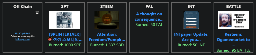Currently shows STEEM posts that have BURNED tokens from last 7 days, 60 days if its a BATTLE, PAL, INT or SPT.