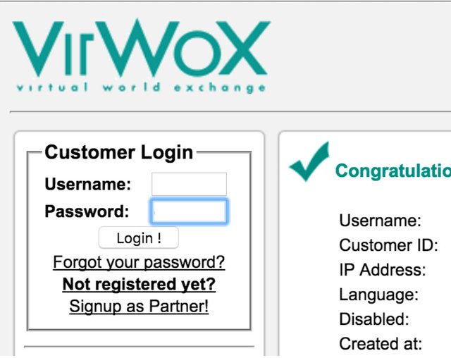 Your username is what you've entered in Step 2 - and your password is the one contained in the confirmation mail you've received from Virwox.