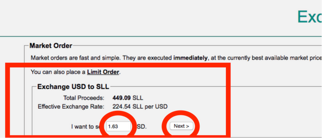 2. In the Market Order pane, sell your currency pair (i.e. I want to sell USD / I want to sell EUR) then enter the amount you would like to exchange and click Next >. This will purchase SLL with your FIAT currency.