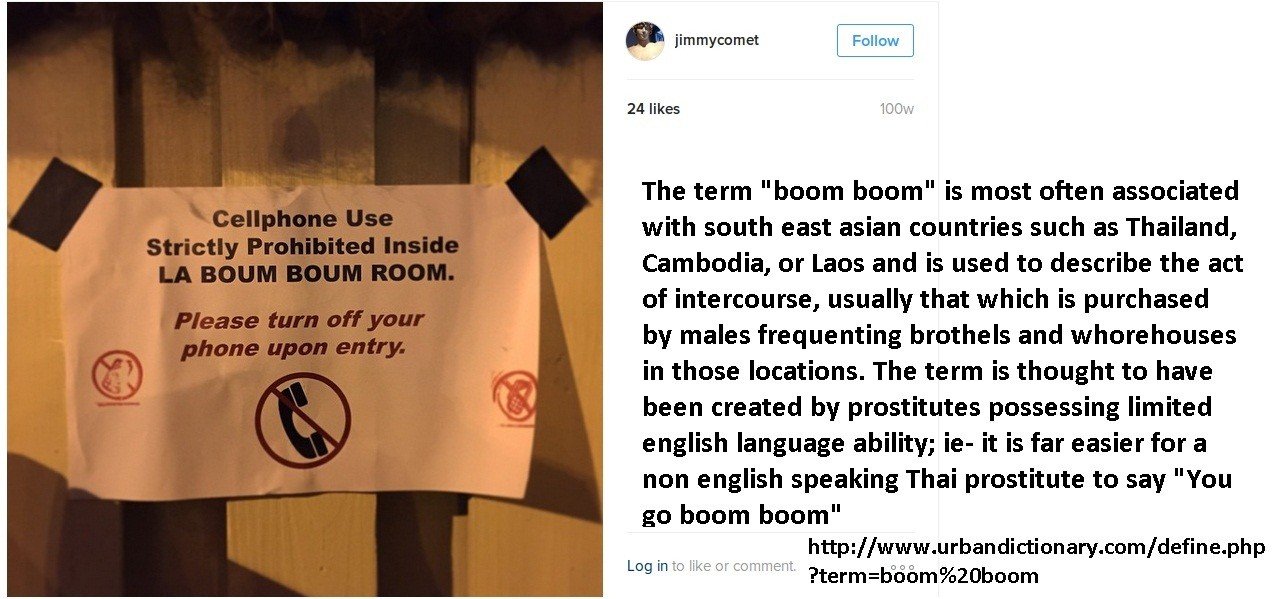 Here he reference a โboom boom roomโ which sounds disturbingly like a play on the phrase โboom boomโ used by foreign prostitutes to describe sex: