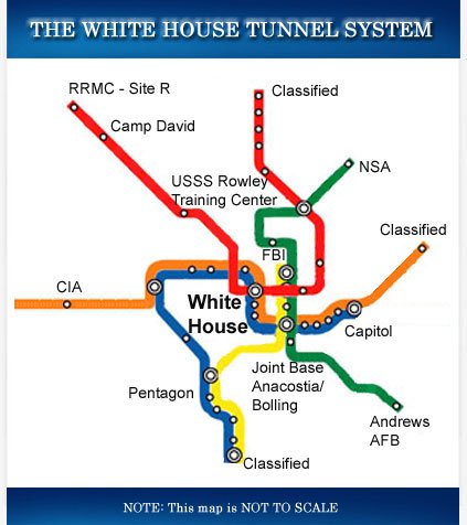 Washington DC has a massive tunnel network across it, publicly admitted. It ties into the old metro system and well as networks exclusive to the white house.. From the white house's old expansion plans: