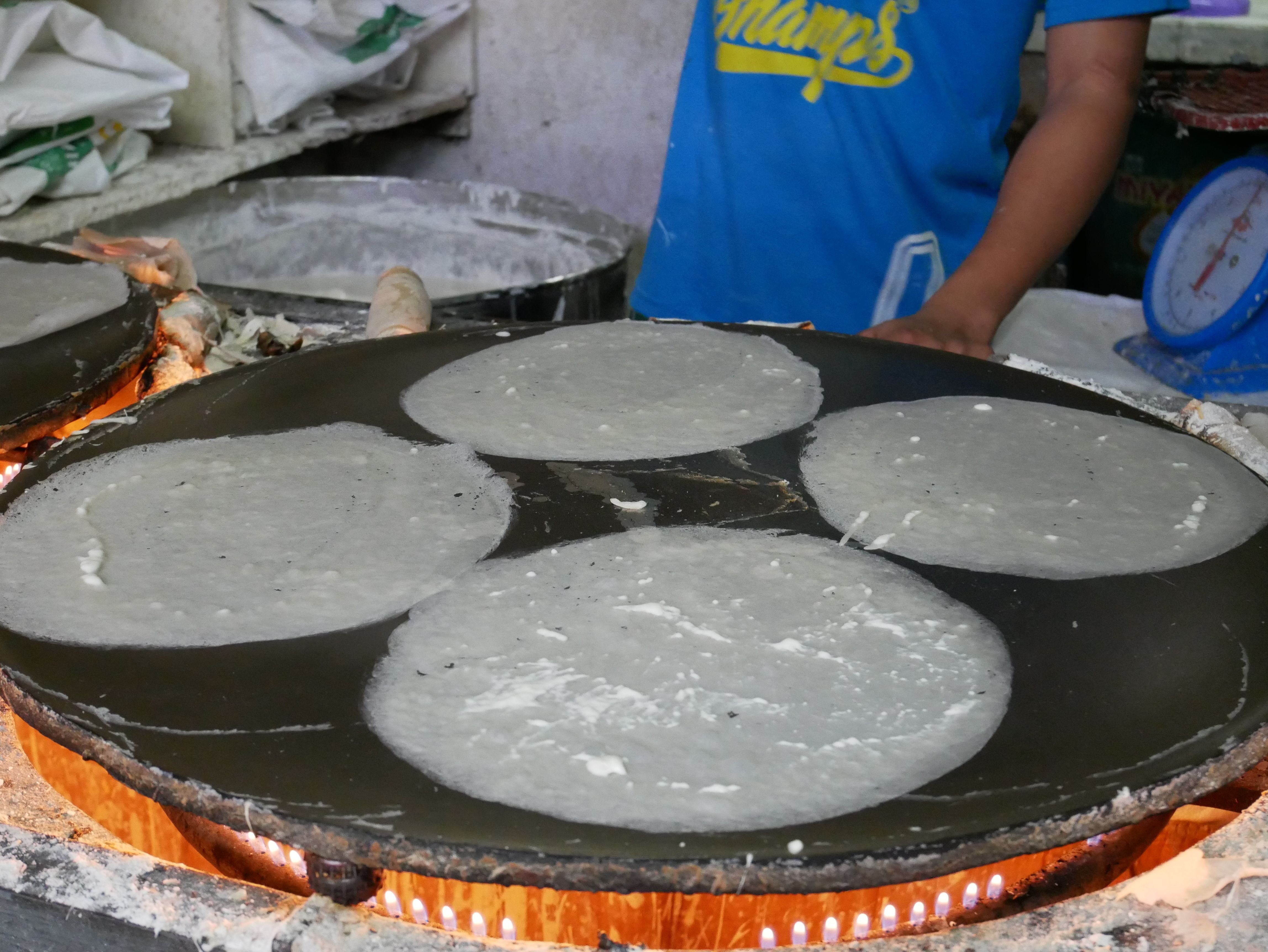 A little bit of oil is spread on the plate just enough for it to be non stick. A handful of the batter is spread using a circular motion until a thin film is made. The skill of the worker is fascinating to watch as the circular motion is performed.