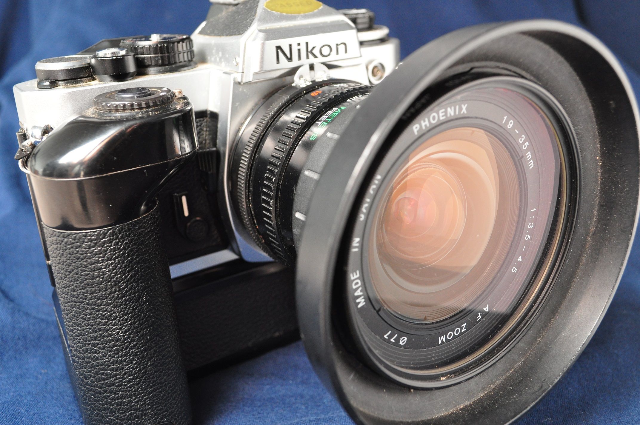 The FE2 has a very decent built-in light meter. I have a range of other accessories and lenses, but most notable are a wide-angle lens and the MD-12 motor drive, providing the body with some extra heft and a firm handhold. And, of course, the benefit of being able to shoot 3.2 frames per second. This is a 8 AA battery powered motor to strap to the bottom of your camera.