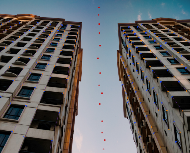 The arrows you're seeing here dictates where certain parts of the photo will flow/move. The orange dots are the origin points and the blue arrows are where they would flow. You can see a clear difference between the arrows on the left building and the right building.