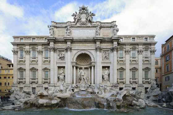 Designed by Italian architect Nicola Salvi and completed by Giuseppe Pannini, it is the largest Baroque fountain in the city. It is 86 feet (26.3 meters) high and 161.3 feet (49.15 meters) wide. Legend has it that tossing a coin into the fountain guarantees a return trip to Rome. The fountain has appeared in many films including "La Dolce Vita" (1960) and "Roman Holiday" (1953).