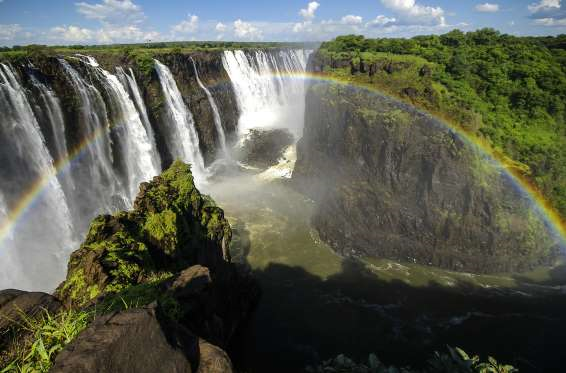 Almost twice the height of the Niagara Falls, Victoria Falls generate mist that can be seen from miles away. The midstream of the falls acts as the national border between Zambia and Zimbabwe, with the national parks of each country adjoining the banks of the river.