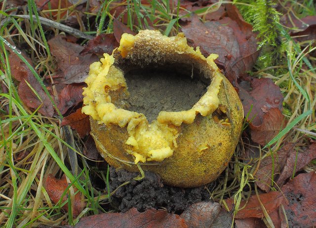 Common earthballs or puffbals simply pop open to spread their spores, not a very elegant or subtle way of procreation, but effective enough. They look like this after having exploded:
