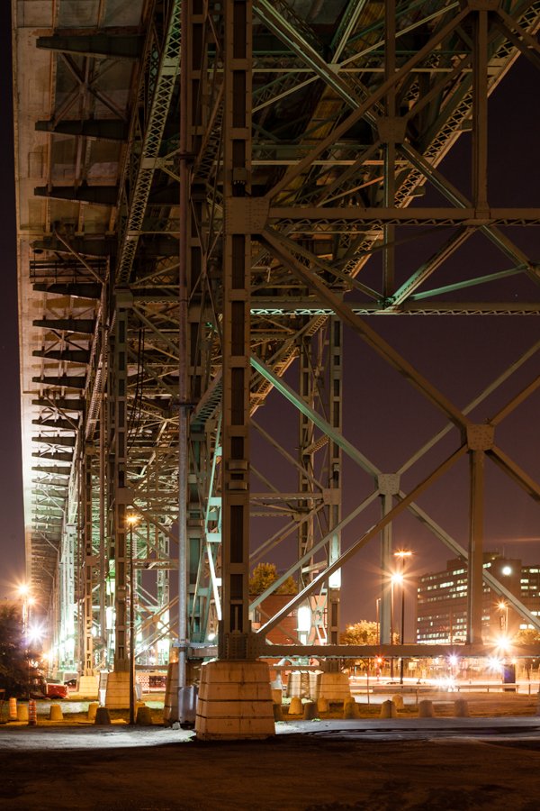 These two are also of the same bridge: the Jacques Cartier Bridge in Montreal. The one on the left is the long approach on the Island of Montreal side, while the one on the right is the main span headed for Saint Helen's Island in the middle of the river. They're not quite what you'd see if you turned around from looking at the other one, but there's only a few hundred feet of difference. The main span vault was taken with the 17mm and has the same dramatic shift effect, while the approach was taken with a normal 50mm.