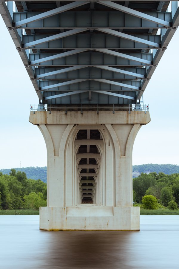 This is the Wabasha Bridge in Wabasha, Minnesota, along the Mississippi River in the southeast corner of the state. This one is a little less dramatic because there wasn't a good place to set up with the 17mm. The first pier was just too far away for that to work. So I switched to my 135mm, which gave me the opportunity to use a neutral-density filter and take a long exposure in the middle of the day.