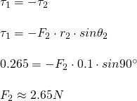 For the wheel to be in a rotational equilibrium, the net sum of the two torques must be equal to zero. We have all the needed quantities to calculate the first torque τ1: