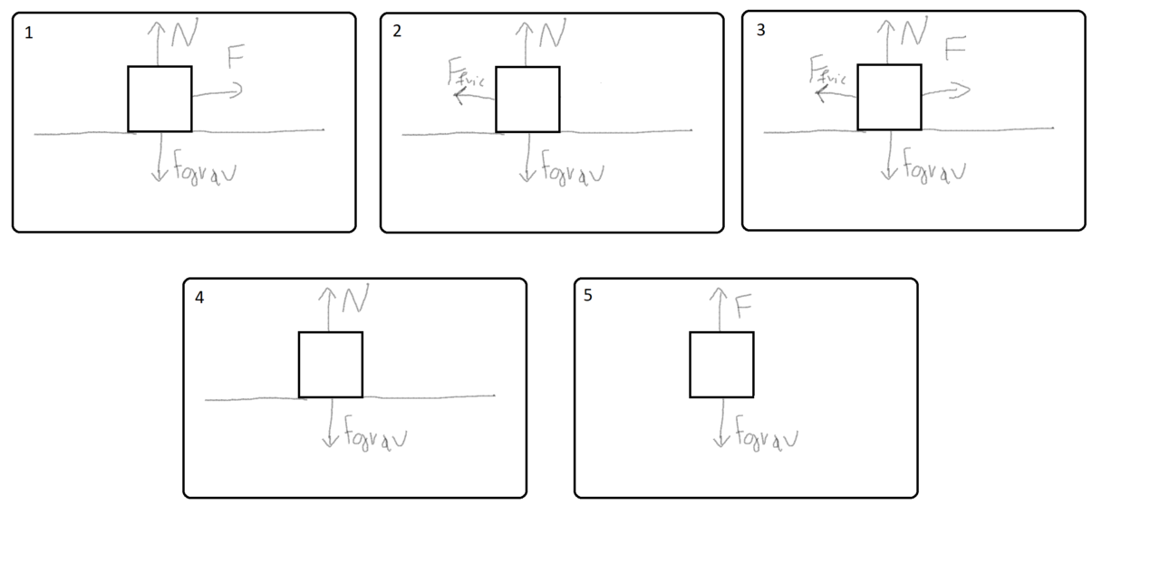 Let's start out with the most important topic, to check your understanding about what is Work and what is not. Consider the following 5 Cases of Free-Body Diagrams: