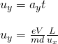 When there is an potential difference V between those plates, with the top one being positively charged, then there is an electric field with a downward direction (E = V/d) that applies a constant force eE upwards to the electron with an acceleration of: