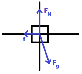 Notice that the velocity in the x-direction is constant and the velocity in the y-direction is affected by gravity, slowing it from positive speed to negative speed. - Draw a free body diagram to model the situation. Assume the box moves.