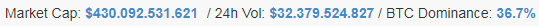 En el caso de la totalidad del criptoespacio y tomando como referencia los datos extraídos de Coinmarketcap.com, el valor sumado de todas las criptomonedas juntas asciende a unos 430.000 millones de dólares.