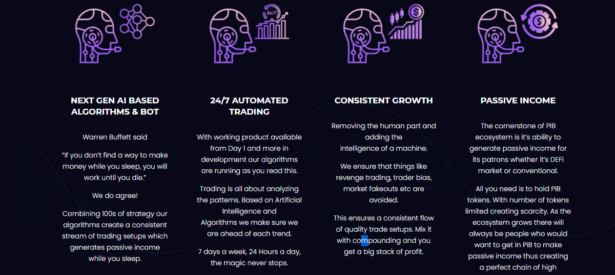 PIB - это экосистема торговых алгоритмов, ботов и трекеров, основанная на искусственном интеллекте и прикосновении лучших человеческих трейдеров.