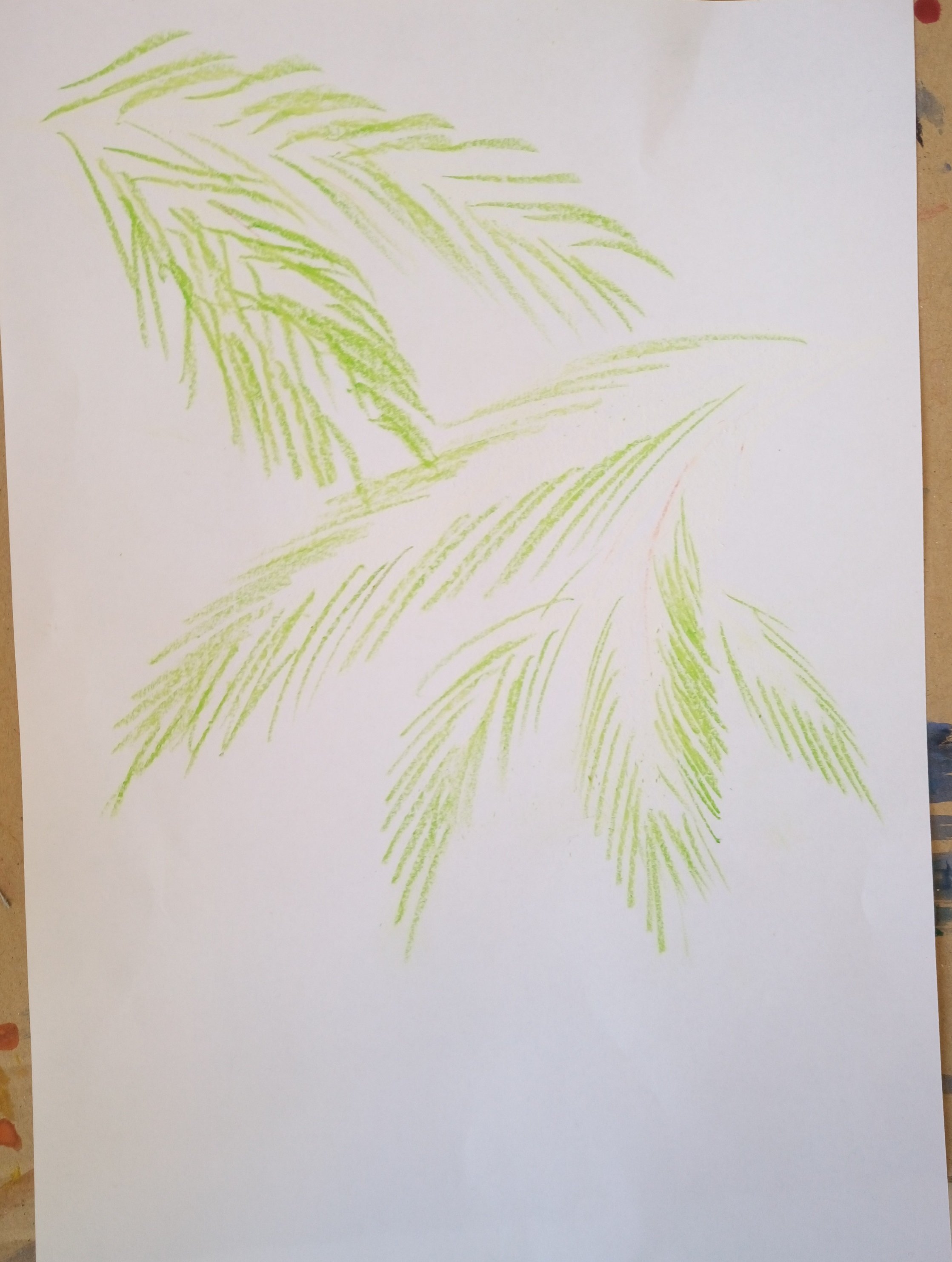 We begin with the fact that on a white sheet wax (or white wax crayon) I draw the basis of spruce branches. This will be the part that is covered with snow.
