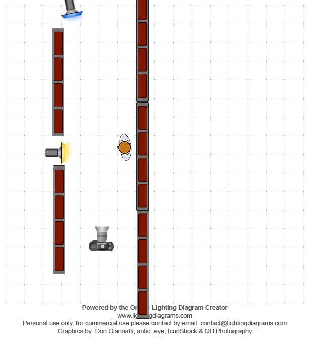 That's almost exact. The blue light in the back was just a touch more straight-on to the camera. The orange light was, just as pictured, in an open doorway. I used a tight grid to keep the edge of the light (the orange halo around his head) super hard. Simple and fun. Warm and cold is one of my favorite color combinations :)