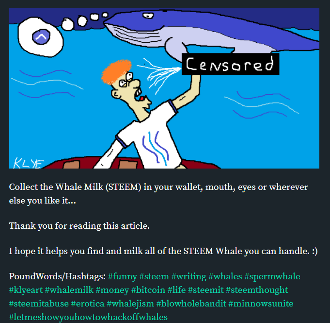 With crudely drawn male genitalia basically acting as my bread and butter before hand but the STEEM community not exactly ready for the "full monty" that is KLYE ART I'd modified the way I drew things.. Leaving out the engorged details and opting to censor my art a bit for better acceptance. An example of this can be seen in the art below from my early post entitled "How to Milk a STEEM Whale":