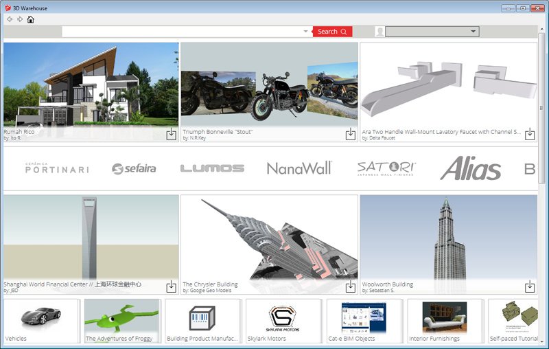 The 3D Warehouse works in a very similar way to the Extension Warehouse, however instead of giving you access to additional plugins you can install, you get access to many free to use 3D models. This might not be that useful when designing a 3D model for 3D printing yourself, but you might still want to check if there isn't a 3D model of the thing you are trying to do that can save you some time. Also if you are designing some scene that included multiple items in it can be handy just to import some readily made 3D models in it.