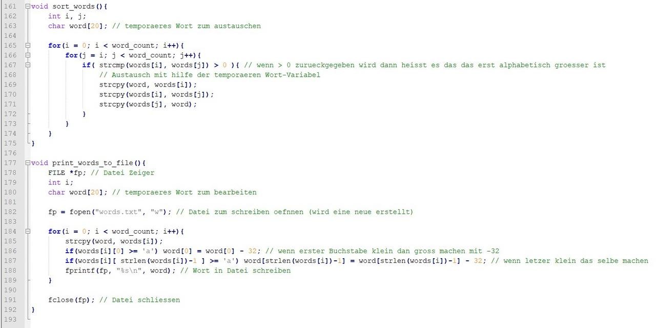 - Alle Wörter in einer neuen Datei mit dem Namen: "words.txt" in alphabetischer Reihenfolge und mit ersten und letzten Buchstaben kapitalisiert (großgeschrieben) ausdrucken.