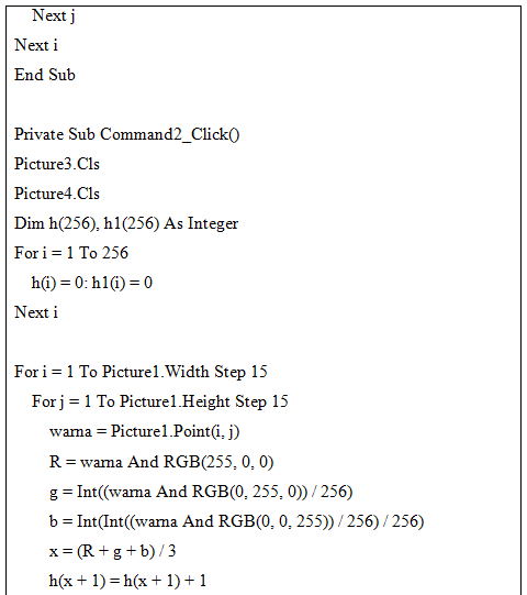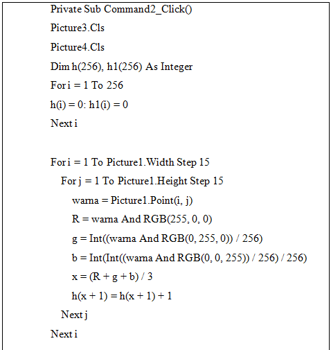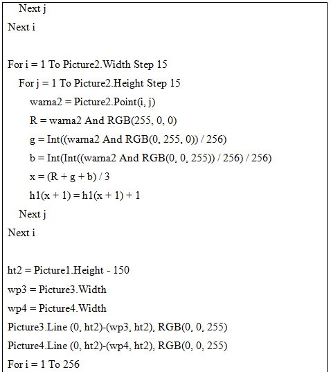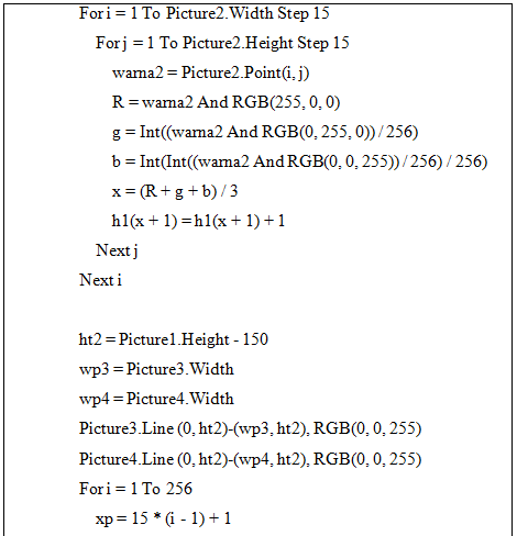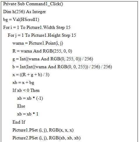 - For j = 1 To Picture1.Height Step 15 //Perulangan matrix untuk lebar gambar, yaitu dimulai dari index 1 sampai tinggipada Picture1 · warna = Picture1.Point(i, j) //Untuk mengambil setiap titik pixel matrix yang ada pada gambar