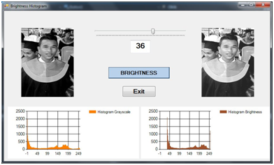 - Me.Chart2.Series("Histogram Brightness").Points.AddXY(i, h2(i)) // Membuat diagram atau histogram dari chart2 yang bernama series “Histogram Brightness” dimana nilai diambil dari pixel atau nilai titik dari sumbu x dan y dan juga dari nilai i, h2(i)