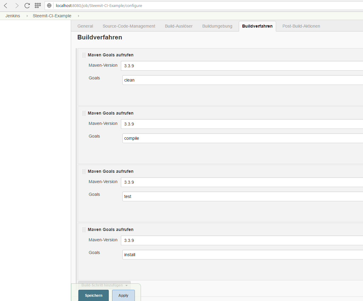 Now jump back to our build and scroll to the “Build” category. You can now add new build steps of the type “Execute Maven goal”. Take care to select the Maven-Installation we’ve defined before and just put in our goals. The result should look like this: