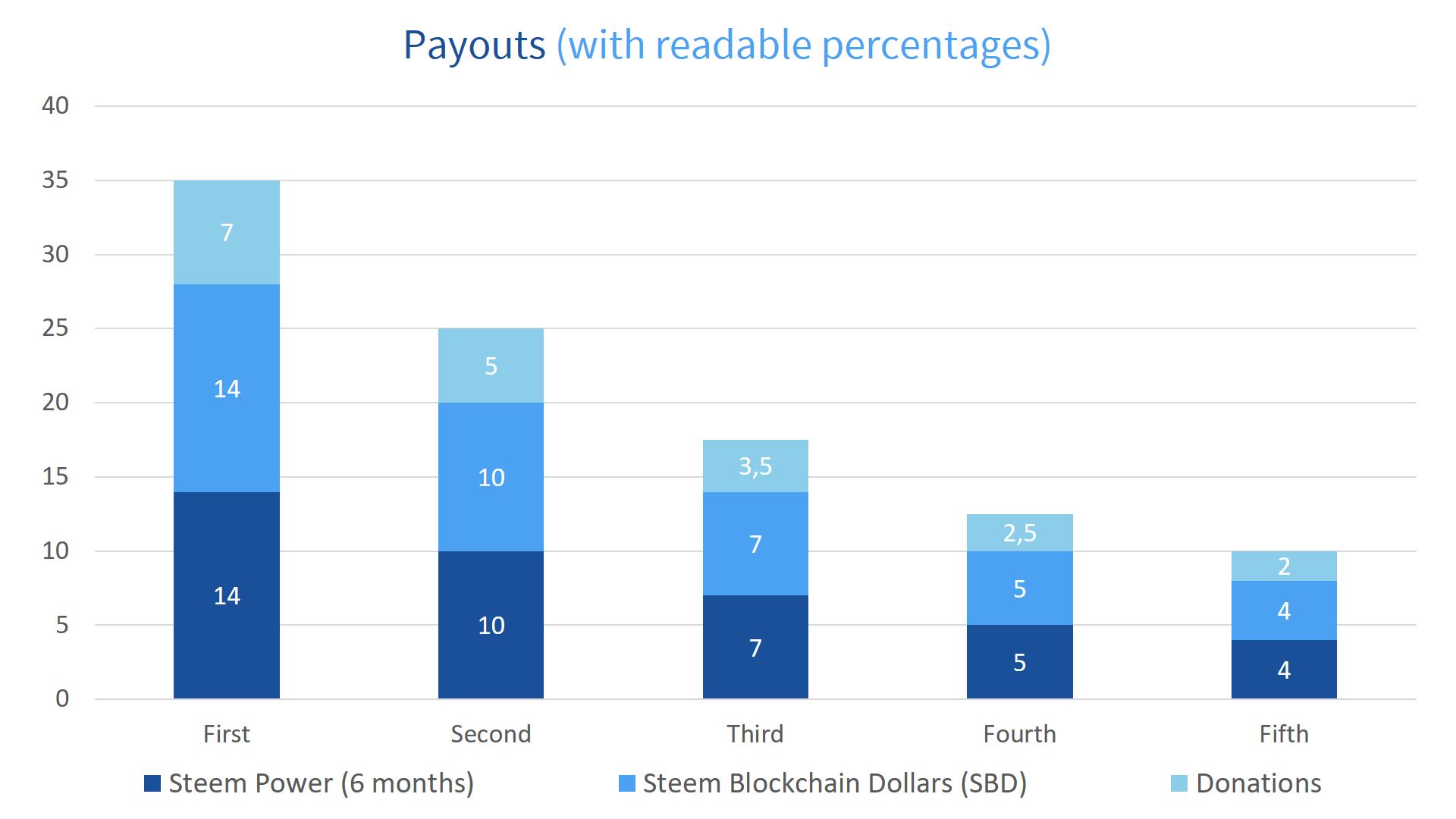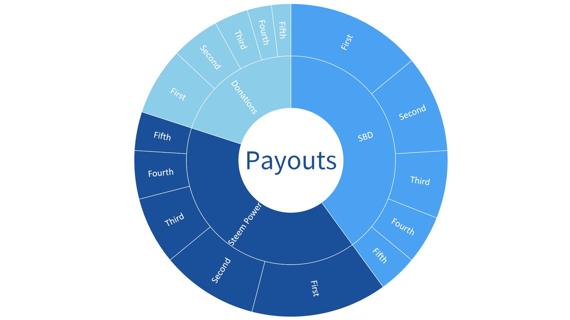 You may already know that some game jams have a little plus: the rewards. Steem Jam will obviously do its best to distribute rewards to participants but not in the same fashion as most game jams. Instead of having a fixed reward percentage depending on the ranking, each participant will see his reward percentage vary depending on his percentage of the total votes on all games. This system will be in place to avoid situations of two users having a very similar number of votes and yet getting very different rewards. Rewards will come from two main sources: posts published by @steemjam and donations. The entirety of SBD raised with the @steemjam posts will be split between users according to the above system while the Steem Power raised will be delegated to users for a period of 6 months, after which @steemjam will stop the delegation and be able to do whatever it wants with the Steem Power. However, this rule doesn't apply to winners announcement posts for which all the payouts (SBD and Steem Power) will be split between participants thanks to the Steem Whales payouts sharing tool. Donations will also be split between participants without Steem Jam taking a single dime of it. Don't forget that besides money, game jams reward you by making you acquire new knowledge and meet unique people you wouldn't have met otherwise. The following graphs are meant to give you an overview of the reward system, click on them if you wish to see a bigger version of them. They don't take the winners announcement post into account. The example shown in these graphs is the following (random donations value):