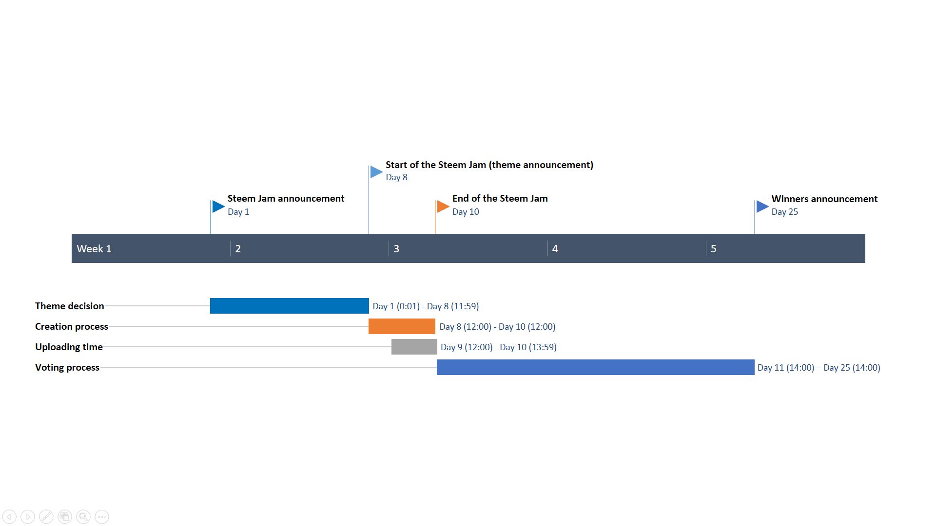 There are supposed to be 6 Steem Jam's organized a year, which is more than most popular game jams. The majority of them will take place during vacation in order to comply as much as possible with game makers schedules. Half of the game jams will last 48 hours (2 days) while the other half will last 72 hours (3 days). The longest ones will mainly take place during vacation. The theme will be announced at the very beginning of each game jam. The community will decide the theme by suggesting different ideas in a period of one week before the start, one out of the 10 most voted themes will then be randomly selected to be the Steem Jam's theme. Following the game creation period, participants will have 2 hours to upload their games on the website, but uploading will in reality be available from the beginning of the second day. Finally, two weeks of voting will follow in which the community will vote for their favorite games. Once the voting is over, the final ranking will be put online and rewards distributed. For an overview of the timeline, check the picture below, you can also click on it to view it in full size as it is barely readable on Steemit.