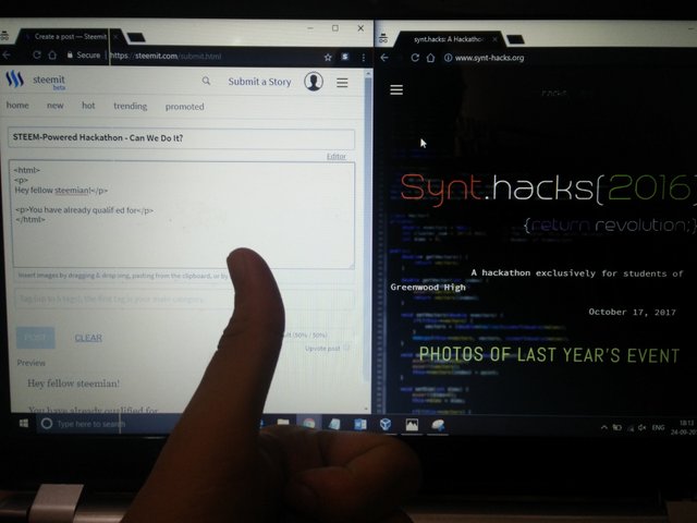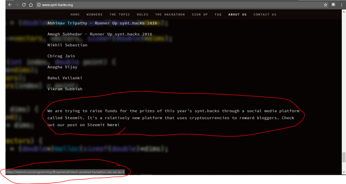 A group of classmates and I are organizing a hackathon in our school, above is a picture of our website for the same. The name of the hackathon is synt.hacks and it is actually an organisation created by some of our seniors from high school. You can find their pictures and bio on the synt-hacks website. The objective of synt.hacks was to provide more opportunities for teenagers to showcase their programming skills.Fun Fact: I had actually won my first bitcoin as prize money at a hackathon two years ago. No, it wasn't 1BTC, it was actually 0.01BTC.