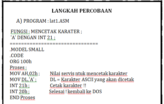 Bila dihasilkan interupsi 21h apa yang akan dikerjakan oleh computer? Jawabnya ada banyak sekali kemungkinan.pada saat terjadi interupsi 21h maka pertama-tama yang dilakukan computer adalah melihat isi atau nilai apa yang terdapat pada register AH.misalkan bila nilai AH adalah 2 maka computer akan mencetak sebuah karakter, berdasarkan kode ASCII yang terdapat pada register DL. Bila nilai pada register AH bukanlah 2, pada saat dilakukan interupsi 21h maka yang dikerjakan oleh computer akan lain lagi. demikian kita bisa mencetak sebuah karakter yang diinginkan dengan meletakkan angka 2 pada register AH dan meletakkan kode ASCII dari karakter yang ingin dicetak pada register DL sebelum menghasilkan interupsi 21h.