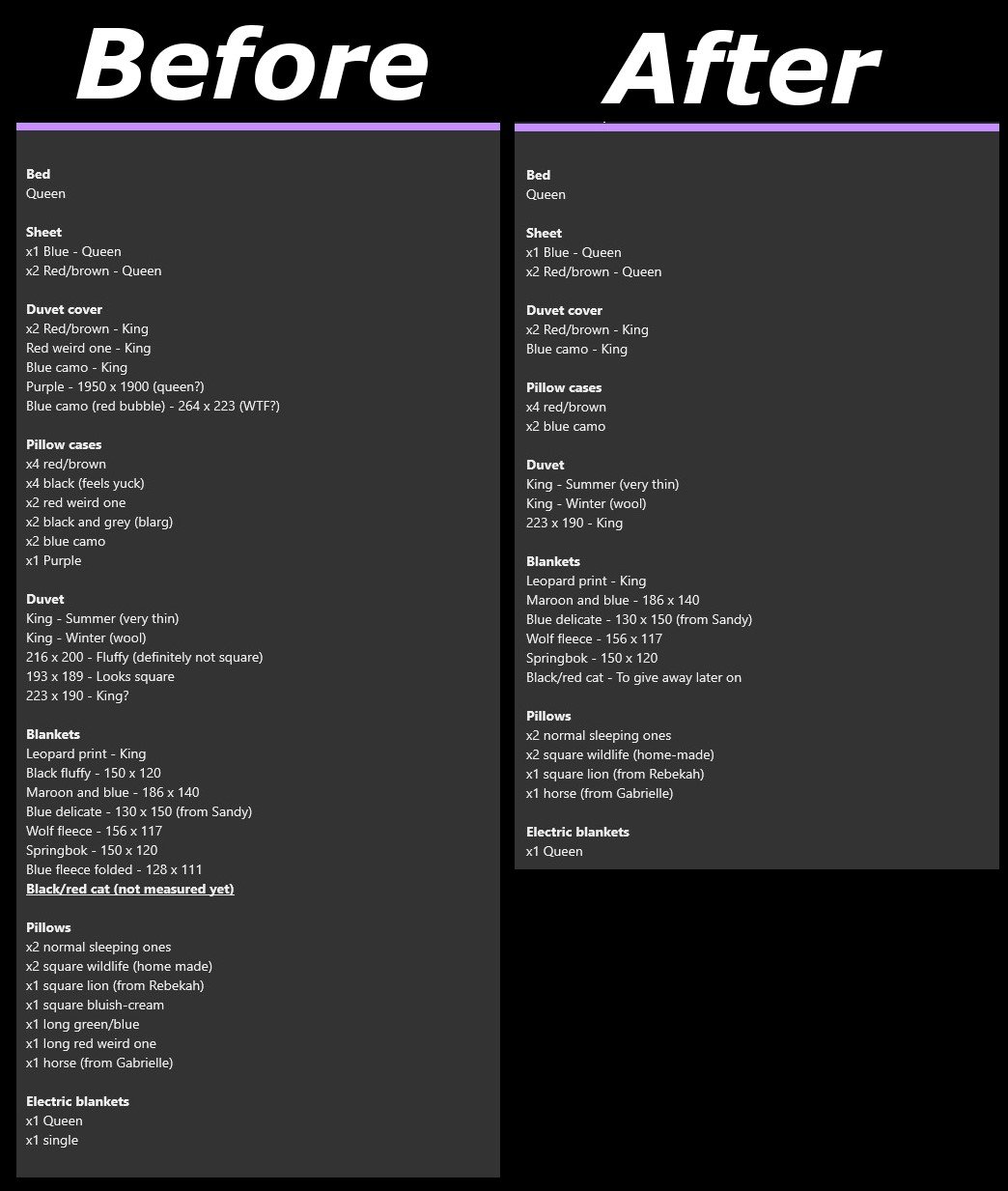 Anyway, this task took several days as there was one duvet that I was pretty sure was a king, but the only way to be sure was to put it inside our current duvet cover and see if it fit. And everyone knows changing bed linen is one of the worst chores. So, I procrastinated a week on that, and got there in the end. Here’s the before and after lists. We gave away anything we weren’t taking with us or didn’t fit. Special shout out to Rebekah, who volunteered to drop stuff off at the Salvation Army during a week I just wasn't coping with.
