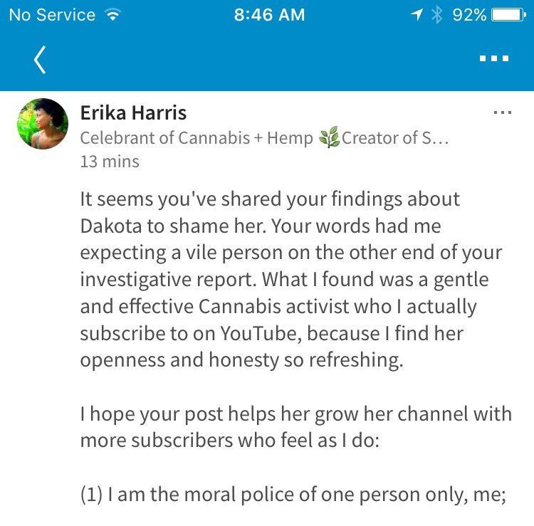 I appreciate Dakota's work. When I was in Illinois, feeling stressed and oppressed, watching her smoke sesh's helped. Seeing someone behave as naturally and freely with the plant as I know we should all be able to, gave me a sense of hope and relief. To see this guy's critique be about HER didn't sit well with me, lol.